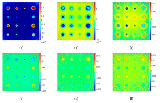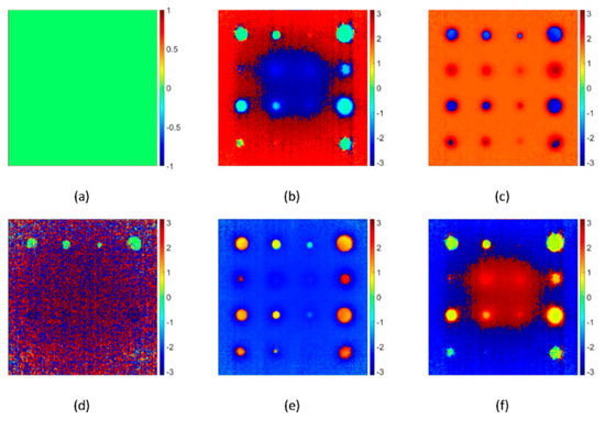 Experimental pulsed thermography images processed by principle component thermography concerning EOFs, (a) 1st EOF, (b) 2nd EOF, (c) 3rd EOF, (d) 4th EOF, (e) 5th EOF and (f) 6th EOF. The scales are in “digital level” units.