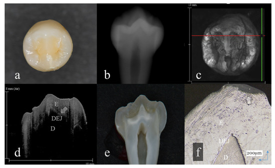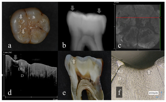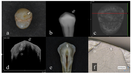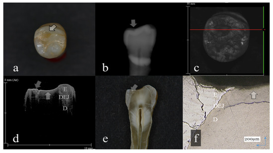 - Segarra, M.S.; Shimada, Y.; Sadr, A.; Sumi, Y.; Tagami, J. Three-Dimensional Analysis of Enamel Crack Behavior Using Optical Coherence Tomography. J. Dent. Res. 2017, 96, 308–314. [Google Scholar] [CrossRef]