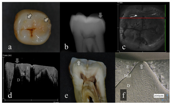 - Shimada, Y.; Sadr, A.; Burrow, M.F.; Tagami, J.; Ozawa, N.; Sumi, Y. Validation of swept-source optical coherence tomography (SS-OCT) for the diagnosis of occlusal caries. J. Dent. 2010, 38, 655–665. [Google Scholar] [CrossRef]