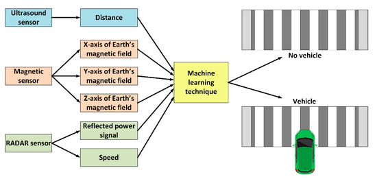 For this purpose, two classes are used: “Vehicle” and “No vehicle”, represented as 1 and 0, respectively. These classes are used as ground truth (GT). Measurements from sensors were normalized using the Min–Max method for an adequate performance of the ML algorithms [42]. Normalization values are also shown in Table 1.