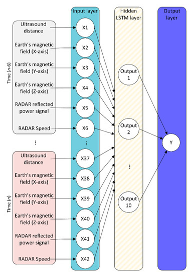 To avoid the system generating inconsistent visual alerts, it is necessary not only to consider the current measurements from sensors but also the last few ones. This way, the output of the system will depend on a sequence of observations. This means that the vehicle detection problem can be treated as time-series forecasting, allowing the use of an LSTM architecture. LSTM networks are an important piece in modern time-series forecasting and to sequence deep learning models. The reason for using an LSTM instead of others (e.g., statistical autoregressive models) is that LSTM networks can be integrated into DRL architectures, as explained below. An LSTM is a recurrent neural network (RNN) equipped with gated cells able to remember important information and forget the irrelevant. An LSTM converts the input sequence into memory and hidden states. These can be used to forecast future data based on some training samples, and it offers better long-term modeling and a more robust vanishing gradient than conventional RNN. However, an LSTM requires more computational and memory capacity due to the multiple memory cells [39]. As shown in Figure 3, the used LSTM-based neural network architecture consists of a total of 42 input neurons, corresponding to the number of time instants and different sensor measurements for each time instant. Then, the LSTM layer is made up of 10 units that are fully connected to the input layer. Finally, the output layer is made of a single neuron completely connected to the LSTM layer, being this neuron responsible for predicting whether a vehicle is—or is not—currently over a crosswalk. The neural network structure has been determined following the instructions described in the Parameter Settings section.