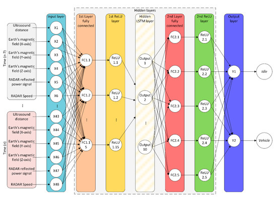 The agent (usually represented as a deep neural network for efficiency purposes) observes a state from the environment and performs actions. According to the performed action, it receives a reward and a new state. The agent’s objective is to maximize the accumulated future reward. Therefore, training an agent means to find a policy that will map states to actions such that the accumulated reward received by the agent is maximized. In this work, the DDRQN model is used [40]. DDRQN uses an LSTM layer (i.e., LSTM–DRL) to obtain time relevance between consecutive states. This allows to reduce the overestimations and the number of operations to calculate them [41]. Therefore, the agent developed in this work uses the current and historical data in its state to recognize time-related events. The reward function is as simple as 1 if the agent selects the right class, and −1 otherwise. This rewards the agent for correct selections and penalizes it for wrong ones. The action space of the agent is {“No vehicle”, “Vehicle”}, where the LSTM–DRL agent decides if there is a vehicle approaching the crosswalk, or not, according to the received sequence of observations from the sensors.
