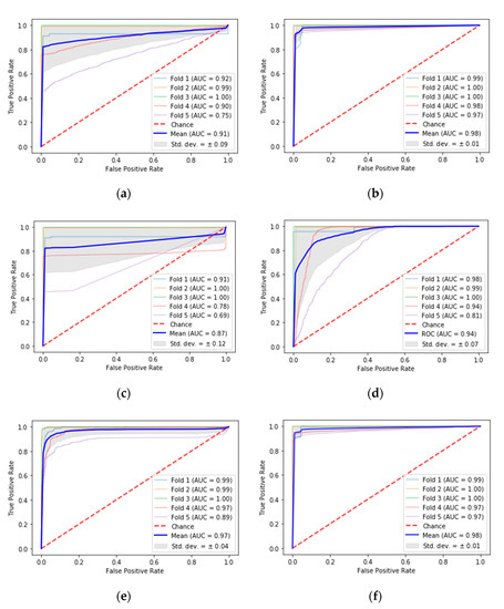 ROC analysis: (a) logistic regression; (b) random forest; (c) multi-layer perceptron; (d) one-class SVM; (e) long short-term memory; (f) deep reinforcement learning.