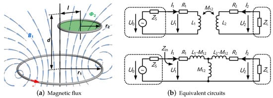 In general, near-field communication is based on the principle of inductive coupling, where a sinusoidal current of amplitude and angular frequency is injected into a primary coil and thus generates a magnetic field of flux density . In a secondary coil spanning the area , creates a magnetic flux (see Figure 1a)