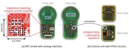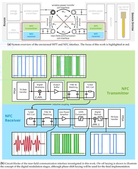 Near-field communication (NFC) has proven to be a reliable data transfer technology in a series of biomedical implants and devices: the communication interface, based on inductive coupling of two coils, is hereby complementing the actual sensor front-end by establishing the connection to the corresponding data processing unit. Among others, inductive communication technologies have been applied in biomedical sensor systems to monitor physiological parameters such as heart rate, blood pressure, or gastrointestinal activity [,], to analyze biochemical fluids [,], to improve hearing in cochlear implants [], to reestablish vision in retinal implants [], and to analyze and record neural signals in the context of brain–computer interfaces [].