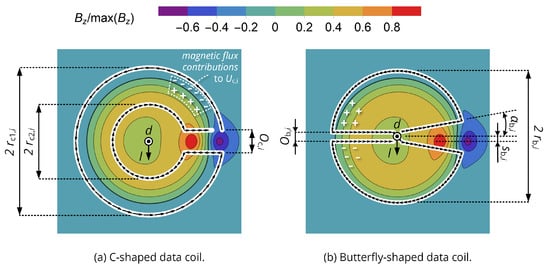 The C-shaped data coil can now achieve zero mutual inductance to the energy coil by incorporating flux components of negative sign in the range of the outer winding part and flux components of positive sign along the inner winding part. As the inner winding part is the return line of the current and only the enclosed area contributes to the net flux such as given by (1), the center of the flux distribution does not affect the induced voltage. To include negative flux components, must be slightly larger than the radius of the energy coil, while is swept in a numerical simulation to yield a design with no coupling to the primary energy coil.