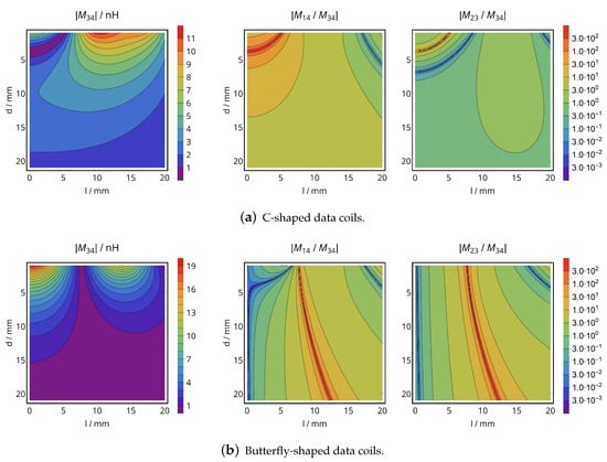 With this numerical approach, both coil topologies were optimized for minimal interference to the on-substrate energy coils by selecting or to yield . In all cases, an outer radius of 17 mm for the primary and 7 mm for the secondary data coil (slightly larger than the energy coils) and three turns (yields inductance values that allow a suitable impedance matching to 100 Ω, see the next section) are assumed. Subsequently, characterizing the data interface as well as and , characterizing the interference to the WPT system, are computed from (6) for various distances d and lateral misalignments l (cf. Figure 3 for coordinates).