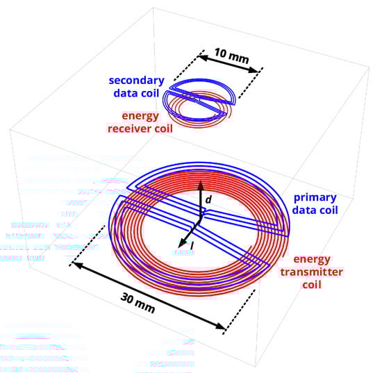 When being axially aligned, the butterfly-shaped coils show a monotonic decrease of the data coils’ mutual inductance for an increasing distance and feature a particularly small mutual inductance to the energy coils (low interference), so that they are selected for the system implementation due to these favorable characteristics. Still, it must be noted that the butterfly-shaped coils also exhibit a zero of mutual inductance for lateral displacement, being situated at for the given design.