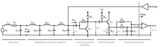 Apart from the digital receiver and the NFC resonators, the data link includes an analog front-end with a receiving amplifier and a reactive network which provides both filtering of the energy carrier and impedance matching of amplifier and resonator. Its topology and connection to the low-voltage differential signaling (LVDS) comparator stage and the output buffer of the FPGA are shown in Figure 7.