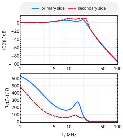 As the impedance is matched over a relatively large frequency range and as the cutoff frequency of the resulting filter should be as low as possible (suppressing the power carrier at 40.68 MHz while still passing ), the nominal frequency to compute inductors and capacitors was set to 9 MHz instead of 13.56 MHz; the component values obtained from this method are given in Table 2, transfer function, and input impedance provided to the resonators are summarized in Figure 8 for the assumption of ideal components.