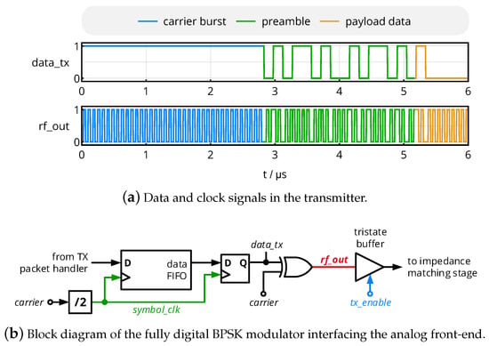 In particular, the objective is to create a near-field communication interface using a 13.56 MHz carrier with a symbol rate of 6.78 MHz, so that only two carrier cycles will encode a single symbol. As the digital receiver will only allow for constant-envelope modulation [] and as on-off keying has the potential drawback of ringouts still being detected as an active carrier, binary phase-shift keying will be used as a modulation technique. The expected raw data rate is thus 6.78 MBit/s. While a higher data carrier frequency (e.g., 27.12 MHz) could be chosen to theoretically increase the communication bandwidth, it also correlates with a higher sampling rate, implying a higher power consumption, and with a reduced frequency separation of energy and data carrier, increasing interference for the same steepness of the filtering stages.