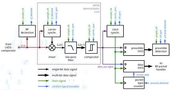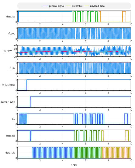 A snapshot of the link’s most important intermediate and output signals is shown in Figure 20, which were simultaneously acquired by a Saleae Logic Pro 8 multi-channel logic analyzer and a Rigol MSO5074 oscilloscope: The time sequence descriptively shows how the outgoing data stream is translated into a BPSK-modulated rectangular wave, which is then transmitted over the analog channel and recreated by the receiver’s comparator. After RF detection and synchronization, the mixer’s output signal is low-pass filtered to obtain the received data sequence data_rx and recovered clock data_clk, which corresponds to the incoming data sequence. Preamble and payload data are highlighted to show the identity of data_tx and data_rx and to prove the operability of the link.
