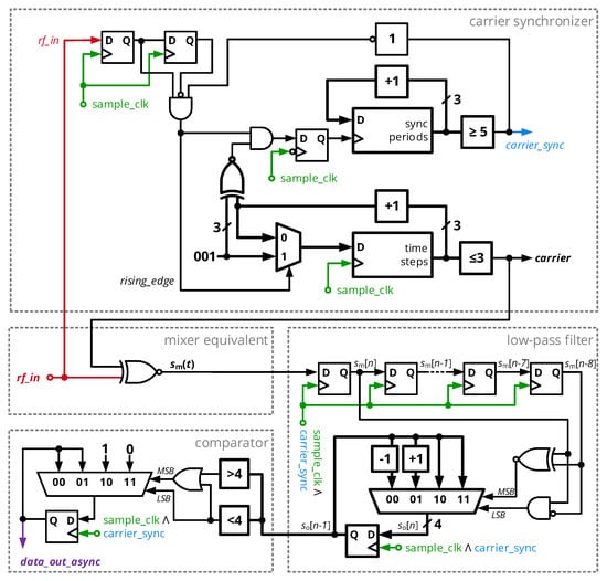 - Modulation and demodulation circuits shall be realized as purely digital circuits to enable a compact implementation. This means that the modulated carrier is generated as a rectangular wave in a digital circuit; a digital class-D output stage successively applies the signal to the analog filtering and data coil stages, which extract the modulated sinusoidal signal. In the receiver, the sinusoidal signal is converted back to a rectangular wave by a comparator stage, and is then demodulated by a purely digital circuit. While comparator-based receivers processing rectangular signals [,] and single-bit sampling receivers processing time-discretized samples of a rectangular signal [] were conceived for biomedical near-field communication, the reliability of their custom demodulation stages in terms of the bit error rate is analyzed neither by simulation nor by measurement. Furthermore, their applicability is limited, as they rely on custom CMOS circuits and frequency bands not reserved for industrial, scientific, and medical (ISM) purposes. The unique contribution of this work is to analyze and evaluate a transceiver that adapts the complex and energy-intensive operations of mixing, low-pass filtering and and multi-bit quantization to the domain of single-bit sampling receivers: Low-power digital circuits discretize the analog data signal with respect to amplitude and time and demodulate the samples by applying digital operations of downconversion and filtering. The transceiver shall be implemented based on commercially available and small-scale electronic components, such as recent ultra-low-power field-programmable gate arrays, and adapted to an ISM frequency band to enhance its applicability.