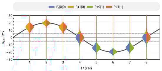 BER vs. comparator input voltage for varying hysteresis, phase noise or amplitude noise parameters according to the model of Section 6. The nominal values of the blue curves are , and . The measurement results of Figure 22 were related to the corresponding input voltage and are shown in black color as a reference for the nominal noise parameters.