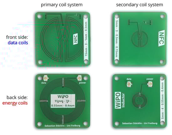 First, it was shown that data coil topologies can be optimized for minimal inductive coupling to wireless power transfer coils situated on the same substrate. While the C-shaped coil performs well for a lateral offset of primary and secondary coil systems, the butterfly-shaped coil combines the advantage of small interference to the complete energy coil system for axial alignment (even for the coil not being on the same substrate) and the advantage of not having zeros of data coil coupling for an axial alignment. This is also supported by the experimental data, which showed that computed and realized self-inductances and mutual inductances are in close agreement, with a maximum relative deviation of about 5%. Moreover, the selective coupling of the data coils on the one hand and the limited mutual inductance of data and energy coils on the other hand even persist in dielectric media, as long as the coils show minor detuning due to a low number of turns.