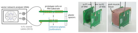 Measurement setup to determine the S-parameters of the coil systems in air and pork tissue environment.