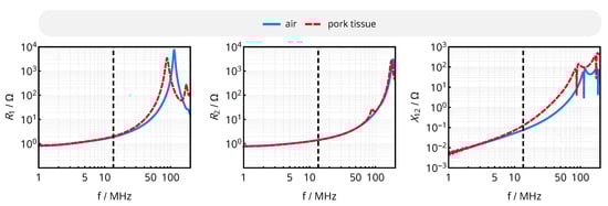 Frequency behavior of the effective coil resistances and the mutual reactance for the given data coil system at a coil separation distance of in air and pork muscle tissue.