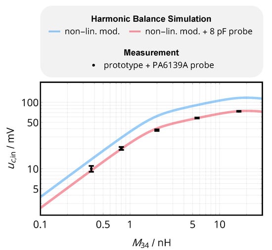 In the next step, the input voltage of the receiver’s comparator , i.e., the output voltage of the complete wireless link including the analog interfaces, is analyzed for various levels of the mutual inductance , corresponding to variations in coil distance and alignment. The voltage is simulated with the harmonic balance algorithm implemented in Keysight Advanced Design System 2016. A SPICE model of the BFR840 transistor was used to simulate the receiving amplifier and the FPGA’s output stage was modeled by an output resistance of Ω and a voltage source alternating between 0 V and ; the measurement probe was modeled by a 8 pF capacitor to ground. Data were also acquired from on the prototype implementation presented above, using a Tektronix MSO4104 oscilloscope and a PA6139A probe. As shown in Figure 19, the comparator input voltage can be reproduced by the numerical simulation and is highly sensitive to capacitive loading, so that a simulative de-embedding of the probe’s capacitance is required (see blue curve). The output voltage is subject to compression for due to the nonlinear behavior of the amplifier and drops below 60 mV (which will later to be determined as the sensitivity threshold) at , which corresponds to a distance of 15 mm.