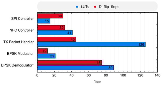 Required resources of the NFC transceiver implemented in a Lattice iCE40UP5K FPGA. The BPSK Demodulator also includes components of the RX Packet Handler.