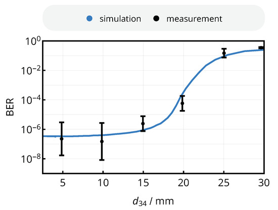 Bit error rate versus coil separation distance in simulation and measurement to characterize the complete link. The simulated data are obtained from the mathematical description of this work and the parameters , and ; the experimental values of the BER include the measurement with five different receiver PCBs and bits of a PRBS-15 sequence each.