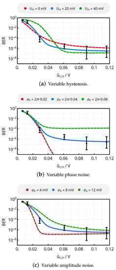 To characterize the receiver only, BER was analyzed versus the input voltage of the comparator stage. Here, hysteresis and noise parameters and are varied from the nominal values in simulation to show the impact of further system optimization. From the results shown in Figure 23, it can be noted that
