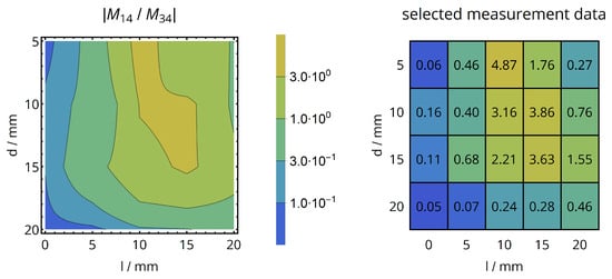Cross-coupling analysis of data and energy coils in pork tissue environment: The ratio of and is shown versus coil distance d and lateral misalignment l, the measurement values on a grid with 5 mm resolution are shown as a numerical reference.