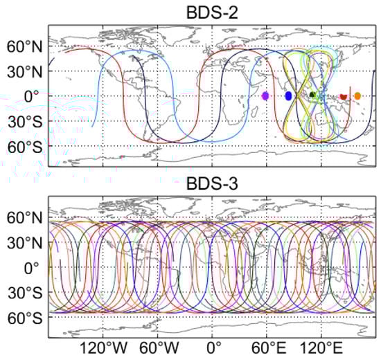 Ground track of BDS-2 and BDS-3 satellites on day of the year (DOY) 140, 2020. Different colors in the figure refer to different satellites.