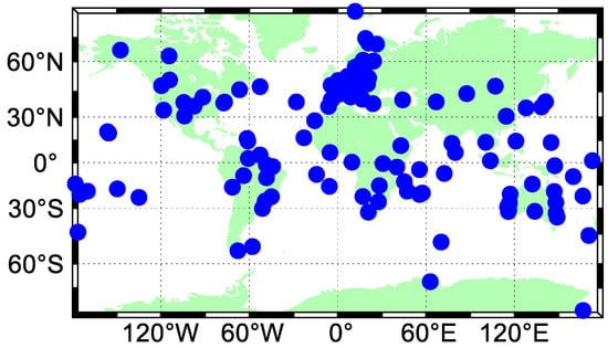 The datasets from a total of 147 Multi-GNSS Experiment (MGEX) stations, at which BDS-3 and BDS-2 signals can be both tracked, are used for the performance evaluation of BDS-3/BDS-2 real-time PPP. The geographical distribution of stations used in our analysis is shown in Figure 2. The cut-off elevation is set to 7°. The sampling interval of the BDS-3/BDS-2 observations is 30 s. It should be noted that the positioning performance of real-time PPP can only be substantially assessed with the use of an observation sampling rate of 30 s. When the sampling interval of observations is reduced, the convergence time of real-time PPP is expected to be shortened [37]. The real-time stream CLK93 released by CNES is employed to acquire the precise corrections for the satellite clocks and orbits in the real-time scenario, on the basis of broadcast ephemeris. The data rate of the CLK93 stream is 5 s. The analysis period covers 70 days from DOY 124 to 193 of 2020 for the assessment of real-time precise product quality, while a time span of a week from DOY 140 to 146 of 2020 is employed for the availability analysis of satellite constellations and the evaluation of real-time PPP performance.
