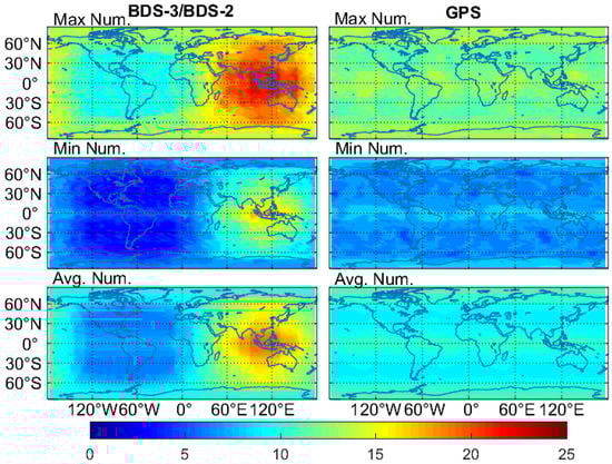 Global maps of the maximum, minimum and average number of visible satellites of GPS and BDS-3/BDS-2 on DOY 140–146 of 2020 (note that a visible satellite has an elevation angle higher than 7°).
