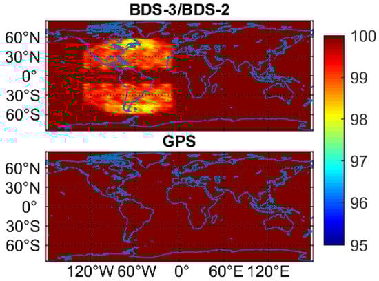Figure 4 exhibits the PNT service rate of GPS and BDS-3/BDS-2 during the analysis period (a week). The service rate refers to the percentage of the time, during which the PNT service is available for use, over the total time. When the PDOP value computed with at least four visible satellites is smaller than 30, the PNT service is considered to be feasible. We can see that both BDS-3/BDS-2 and GPS currently offer a nearly full-time PNT service, except for some American areas where the BDS-3/BDS-2 PNT service rate can decline to 97.6%.