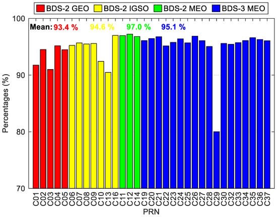 The availability statistic of BDS-3/BDS-2 real-time precise satellite products is shown in Figure 7. The theoretical epoch number is divided by the number of the received epoch-wise real-time corrections to calculate the statistical availability of real-time precise satellite products. There is a satisfied availability for all BDS-3/BDS-2 MEO satellites, which exceeds 95.0%, except for C29, the availability of which is only 80.0%. The availability still exceeds 90.0% for all BDS-2 GEO and IGSO satellites. The average value of availability is computed for each orbit type. The BDS-2 MEO satellites achieve the largest availability of 97.0% on average, followed by the BDS-3 MEO satellites with an average availability of 95.1%. Smaller availability is detected for the BDS-2 GEO and IGSO satellites, which is 93.4% and 94.6% on average, respectively. For comparison, we also calculate the average availability of GPS real-time precise satellite corrections derived from CLK93, and the obtained statistic with a value of 99.3% is found to be larger than the BDS-3/BDS-2 ones.