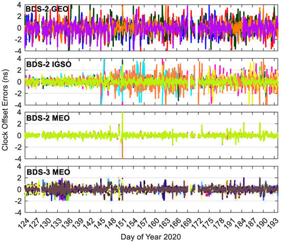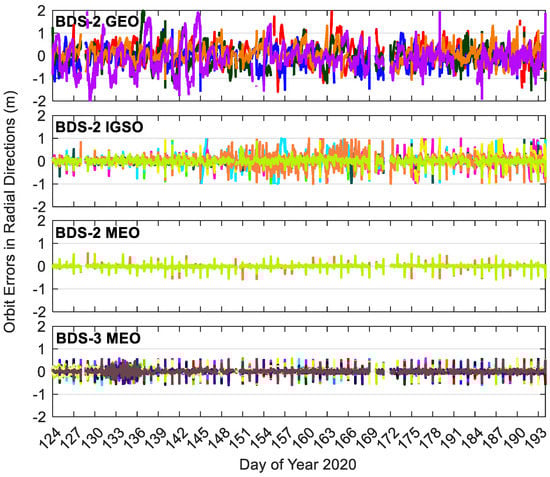 Figure 8, Figure 9 and Figure 10 show the BDS-3/BDS-2 real-time precise satellite orbit errors in the three directions. Figure 11 presents the corresponding satellite clock errors. Different colors represent different satellites. The final precise satellite products from WHU are taken as references. Both real-time satellite orbit and clock offset errors have frequent spikes, indicating that the stability of BDS-3/BDS-2 real-time precise products should be further enhanced. The along-track and cross-track orbit quality are lower than the radial one. Compared with non-MEO satellites, the error magnitudes of MEO orbit and clock products are smaller, and the qualities of BDS-2 MEO products are comparable with respect to those of BDS-3 MEO satellites. Except for the larger orbit errors on DOY 131–136 of 2020 for BDS-3 MEO satellites as well as the spikes, the orbit errors vary in a similar range for the BDS-3/BDS-2 MEO satellites, which is −0.3 to 0.3, −0.3 to 0.3, and −0.1 to 0.1 m in the cross-track, along-track and radial directions, respectively. The varying range of orbital errors for the BDS-2 IGSO satellites is increased by a factor of 1.5 to 2.5 times in comparison with the MEO satellites. As to the BDS-2 GEO satellites, they achieve the largest noise level of orbit errors, which is −6.0 to 6.0, −10.0 to 10.0, and −1.5 to 1.5 m in the three directions, respectively. For the BDS-3/BDS-2 MEO satellites, the errors of real-time satellite clocks fall between −0.5 and 0.5 ns, whereas the corresponding variation range of BDS-2 GEO and IGSO satellites is expanded four times and twice, respectively.