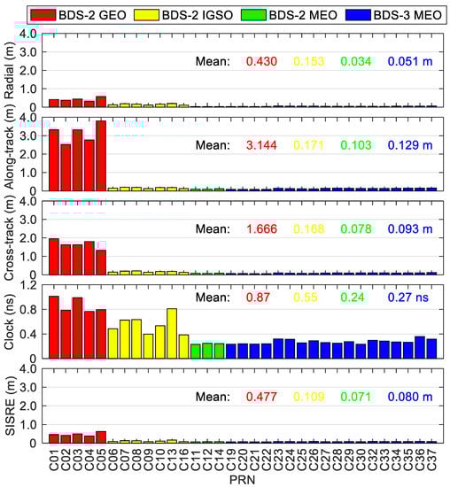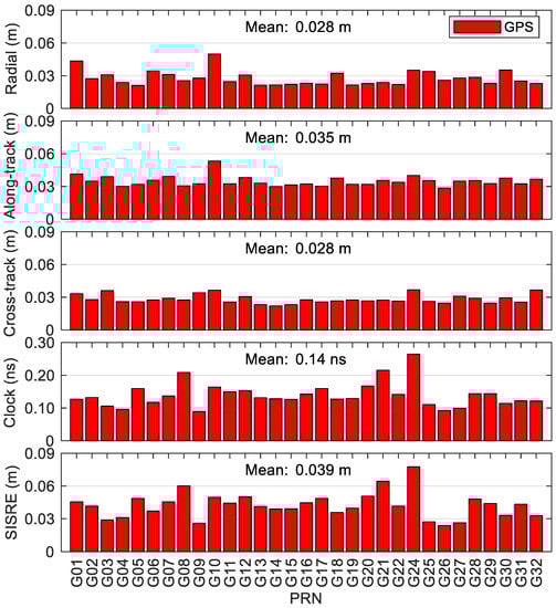 Figure 12 provides the statistics of errors of BDS-3/BDS-2 precise satellite clock and orbit corrections in the real-time scenario. The satellite-dependent statistical values are at a similar level for the satellites belonging to the same orbit types. It can be seen that the average values of the root mean squares (RMSs) of cross-track/along-track/radial orbit errors over the analysis period (70 days) for the satellites within the same satellite constellations are 1.666/3.144/0.430 m for BDS-2 GEO satellites, and 0.168/0.171/0.153 m for BDS-2 IGSO satellites, which are significantly larger than the corresponding RMSs of MEO satellites of BDS-2 and BDS-3 at the centimeter level except for the along-track direction. For BDS-2 GEO and IGSO satellites, the average RMS clock errors are respectively 0.87 and 0.55 ns, which are nearly two to three times larger than the corresponding RMSs of MEO satellites of BDS-2 and BDS-3. The comprehensive contributions of satellite clock and orbit errors to range measurement are usually expressed by the SISRE [35]. The accuracies of real-time BDS-2 GEO and IGSO precise products are 0.477 and 0.109 m in terms of the mean SISRE, respectively, and those of MEO satellites are similar, i.e., 0.080 m for BDS-3 MEO satellites and 0.071 m for BDS-2 MEO satellites, respectively. Figure 13 shows the statistics of errors of GPS precise satellite products in the real-time situation with respect to IGS final products. The mean cross-track/along-track/radial orbit accuracies of GPS are 0.028/0.035/0.028 m and the mean clock accuracies are 0.14 ns, and the corresponding statistics of MEO satellites of BDS-2 and BDS-3 are 1.2–3.7 times larger than the GPS ones (see Figure 12). It is clear that better stability can be achieved for the GPS real-time precise products, and the mean SISRE is 0.039 m, which is about half of that of MEO satellites of BDS-2 and BDS-3.