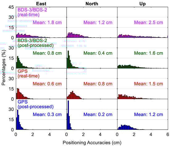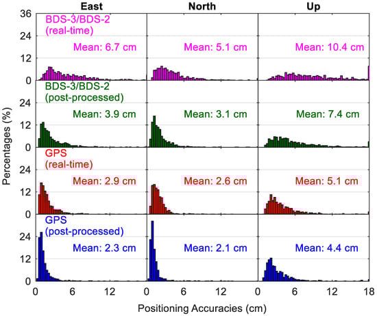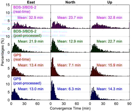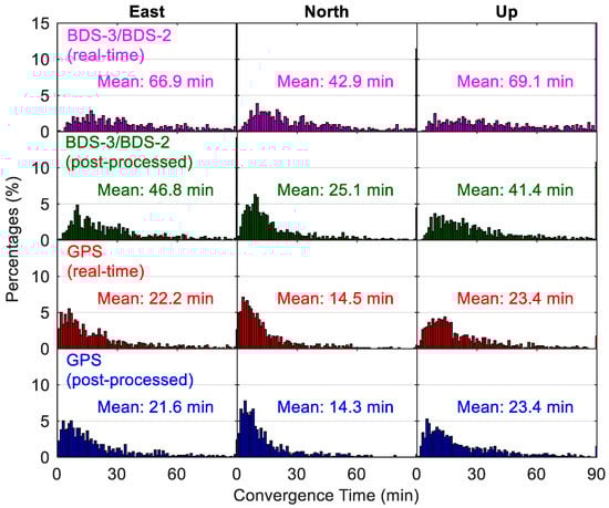 Figure 14 and Figure 15 show the distribution of positioning accuracies and convergence time from different static PPP solutions, respectively. The percentage of position solutions with positioning accuracies worse than 6 cm is indicated by the bar near the 6 cm in Figure 14, and it is a similar case for the position solutions with convergence time longer than 90 min in Figure 15. The absolute value of the position error at the last epoch for each 24-h session is taken as the fully converged positioning accuracy of this data set in the static mode. The convergence of positioning at a specific epoch is identified when the position errors are lower than 0.1 m for the next 10 epochs. We take the time spans from the first epoch to the converged epoch as the convergence times. The BDS-3/BDS-2 real-time PPP solutions with static position accuracies better than 2 cm account for 77.7%, 92.0% and 60.6% in the east, north and up directions, respectively, whereas the derived statistics are 62.9%, 77.6% and 58.7% in the three directions for the corresponding position filters with convergence times shorter than 30 min, respectively. The statistics about the convergence time are derived from an accumulation of the percentages for the bars with a convergence time lower than 30 min in Figure 15. The average results over all the employed days and stations are also computed, and they are presented in each panel. We can see that, although the mean east/north/up positioning accuracies using GPS real-time products are higher (i.e., 0.6/0.8/1.5 cm) and the convergence times are also obviously shorter (i.e., 13.4/7.1/15.9 min), the static positioning using BDS-3/BDS-2 real-time products can also converge to the centimeter level within about 30 min, with mean east/north/up position accuracies of 1.8/1.2/2.5 cm and convergence time of 32.9/23.7/32.8 min. The solutions of BDS-3/BDS-2 static positioning have mean east/north/up position accuracies of 0.8/0.4/1.6 cm in the post-processing mode, which are only slightly larger than the values of 0.3/0.2/1.2 cm of GPS post-processed results, but the convergence performance of the BDS-3/BDS-2 one is still significantly worse than the GPS one. The convergence of BDS-3/BDS-2 post-processing solutions consumes dramatically less time than the BDS-3/BDS-2 PPP using real-time products (on average 10.6 min of reduction over the three directions), and the average value is 21.9/12.9/22.7 min. In contrast, those GPS static positioning using real-time products has a similar convergence performance with its post-processing solutions, i.e., 13.0/6.3/14.3 min, which also confirms the high quality of GPS precise satellite products in the real-time situation. As to the accuracy difference between post-processed and real-time solutions in static mode, it is also notable for the BDS-3/BDS-2 PPP (on average 0.9 cm over the three directions), but at a smaller level for the GPS PPP (on average 0.4 cm over the three directions).