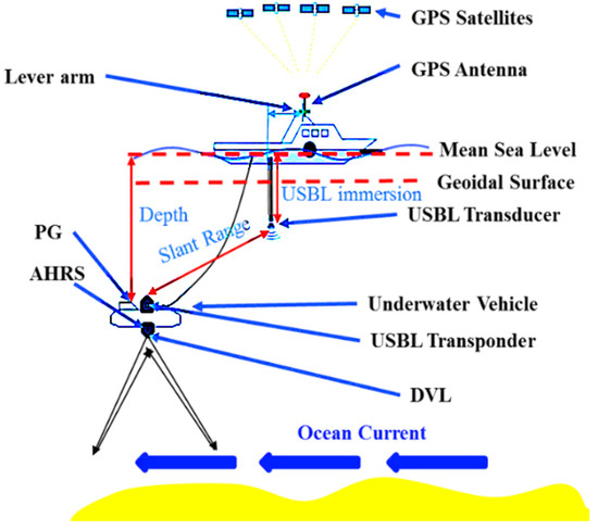 The underwater vehicle (UV) remains the best option for manipulation tasks, such as sampling, detailed inspection, and servicing subsea instruments. In deep-sea, the UV is dependent on the navigation ability to perform long-range and long-term missions near the sea bottom to support a wide range of ocean surveys. For the past decades, numerous underwater navigation schemes have been proposed [1,2,3]. Here, the ultrashort baseline (USBL) system/Doppler velocity log (DVL) integrated navigation is one of the most important ones, since it provides absolute position and is not prone to dead reckoning error in deep-sea. In particular, the USBL system and the DVL are complementary, and conveniently installed in the hull and extensively applied to underwater positioning [4,5]. Additionally, the UV is usually outfitted with a pressure sensor, and the vehicle depth is computed from the direct measurements of the ambient sea water pressure via standard equations for the properties of sea water [6,7]. Combined with the calibration and compensation for depth information, the three-dimensional navigation of the underwater vehicle can commonly be converted into two-dimensional navigation.