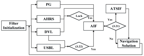 As shown in Figure 3, three discriminant conditions are referenced in the proposed filter. In order to improve the stability and accuracy of filtering, the AIF and ATSIF algorithms are used to estimate the state of the UV with different scenarios. The high-precision velocity measurement of DVL is used as the diagnostic condition of USBL anomaly observation, and the data quality of USBL can be controlled according to the equation in Section 3.2.2. When the USBL is normal and DVL is in the lock model, the AIF algorithm is used to get an accurate navigation solution. When the DVL is in the water tracking model, it is necessary to distinguish whether there are ocean currents according to the equation in Section 3.2.1. If the ocean currents occur, the ATSIF algorithm should be used to compensate the filtering error caused by the unknown currents.