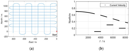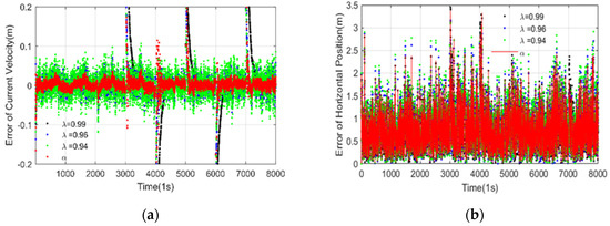 When the time-varying ocean currents occurs, we can naturally introduce the forgetting factor into the recursive Equations (40)–(43). Rewriting Equations (40) and (42), then the adaptive SLS algorithm for estimating the ocean current velocity is as follows: