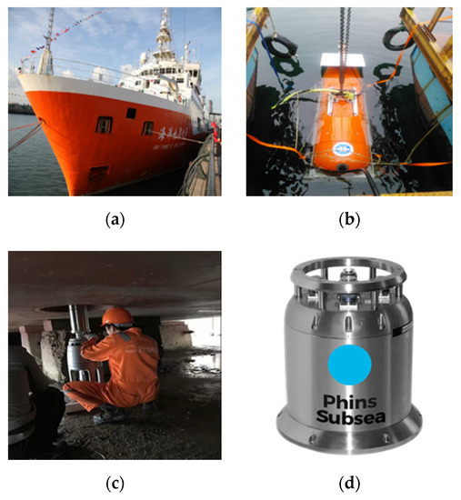 The schematic diagram of the ship (a), deep-sea towed vehicle (b), GAPS USBL (c), and SINS (d).