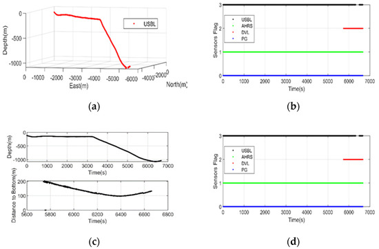 The 3-D position of USBL (a), usability of all navigation sensors (b), the PG data (c), and DVL velocity (d) in the experiment.