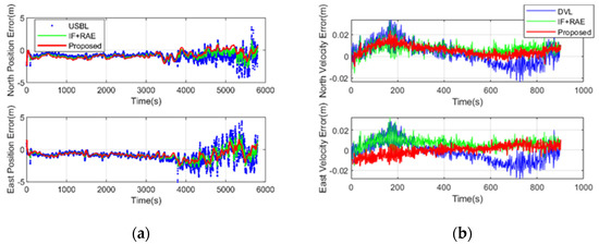 The DVL used in this experiment is in bottom-lock velocity measurement mode (that is, when the distance between DVL and the sea floor is less than 200 m, the velocity of the towing body relative to the seafloor can be measured without considering the influence of ocean currents). The accuracy of USBL will decrease with the increase of depth. Figure 8 shows that USBL even has the situation of missing observation data in the deep-water area (6500 s after entering the water). At this time, DVL velocity measurement information can be used as an effective supplement to restrain the navigation divergence of the SINS system to a certain extent.