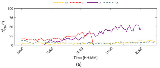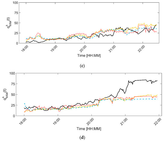 Comparison of simulated and measured flow rate time series for several locations and days, where (a) locations 2—Thursday, (b) location 4—Thursday, (c) location 2—Saturday, and (d) location 4—Saturday.