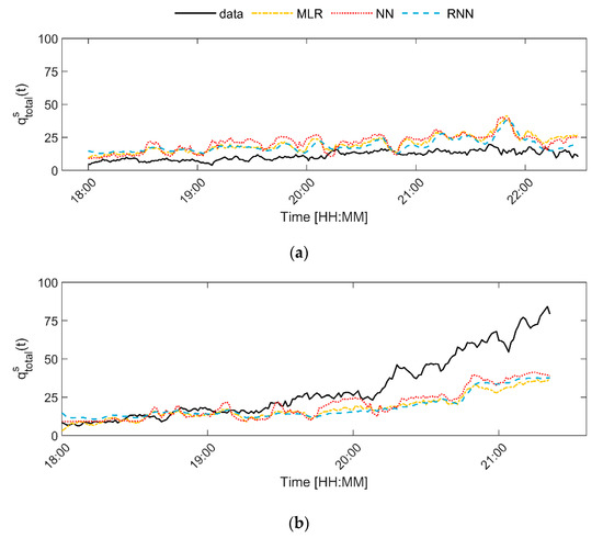 In addition, Figure 6 shows that the RNN model best captures the global trend at lower flow rates. Given that low flow rates occur most of the time, models, which most accurately predict low flow rates, are favored in the calibration process. Thus, the RNN is best capable of capturing both low and high flow rate values.