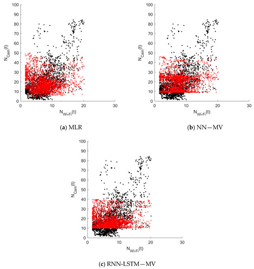 Furthermore, all model types have great difficulty capturing the exact measured values. This suggests that the translation between Wi-Fi counts and flow rate is not as direct as one would expect based on literature and, in particular, the pedestrian fundamental diagram [66]. The authors assume that this finding is the result of the event settings for which these models are estimated. In those settings, a pedestrian space serves multiple purposes simultaneously. That is, pedestrians use the same space to travel from A to B or to watch a performance. Depending on the mixture of these two behaviors, the expected relation between the Wi-Fi counts and flow rate differs. Future research into the unravelling of these two activity types might improve the flow rate estimation.