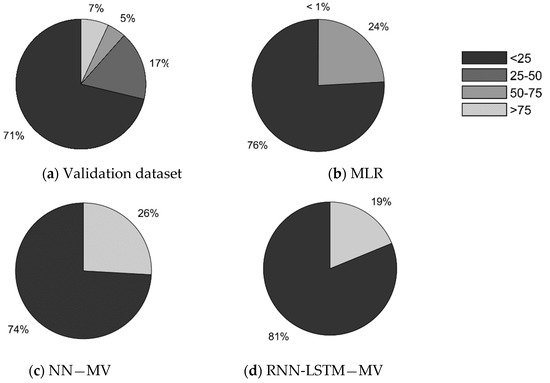 A comparison of the scatter plots of the real data with the models’ results illustrates that all three models have difficulties predicting high flow rates correctly (see Figure 7). This is irrespective of the size of the Wi-Fi count. In all three graphs, distinct horizontal boundaries can be distinguished. An classification of the validation set into four bins also shows that the NN and RNN models do not generate any values higher than 50 (see Figure 8). The MLR model only generates a very low number of values higher than 50 (i.e., < 1%). In comparison with the validation dataset (15%), the complete lack of high value estimates by the models is striking. All three models are specialized in predicting the low flow situations correctly. Consequently, the three ‘best’ models cannot be used to identify high flow rate situations using Wi-Fi counts.