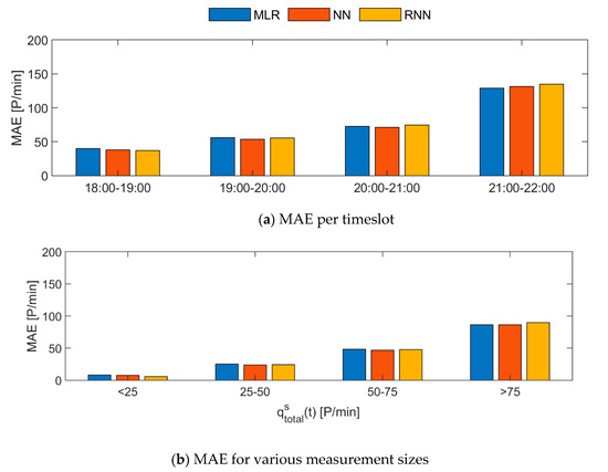Bar graphs comparing the Mean Absolute Error (MAE) of the models’ results for the validation dataset for various timeslots (a) and sizes of the measurement (b).