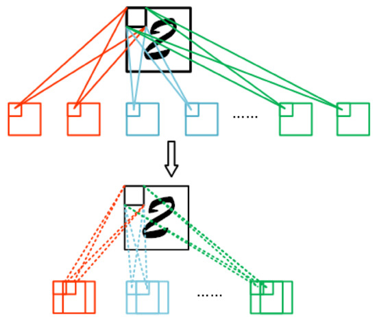The process of agglomerating neurons in fully connected layers is illustrated in Figure 1. The upper part of Figure 1 shows the structure of the neural network before agglomerating. The two neurons drawn with dashed lines in the th layer are two similar neurons divided into the same cluster by the agglomerative clustering algorithm. The colored dashed lines indicate their connections with the neurons in the th layer and the th layer. After the two neurons and their related connections are agglomerated, we can obtain the compressed network structure as shown in the lower part of Figure 1. The two similar neurons in the th layer are agglomerated into a cluster centroid obtained by the agglomerative clustering algorithm, and the connections between the neurons are also merged into new connections with the same colors, constructing a compact network structure.