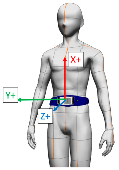 The ASUS Zenfone 6 was used in this study because of the steadiness of the built-in sensor sampling rate compared to other brands such as hTC in our pilot study. The built-in accelerometer was selected because related literature has proven the utility of accelerometers in evaluating sports-related performance [19,24]. The built-in accelerometer provides data on three axes—x, y, and z—with the highest sampling rate of up to 200 Hz. The placement of the smartphone and axial orientation of the built-in accelerometer in relation to the participants are presented in Figure 1.