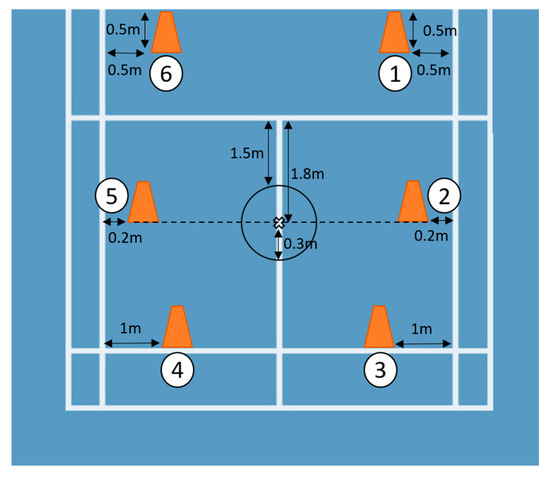 The footwork trial was designed followed by instruction from the school team coach. Six cones were placed in the corresponding locations.