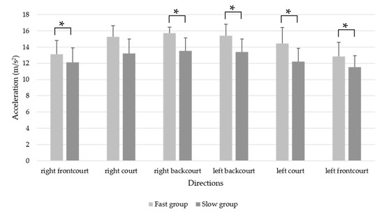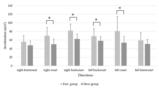Mean acceleration (m/s2) for the whole footwork and in each direction between the fast and slow groups. * p < 0.05.
