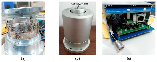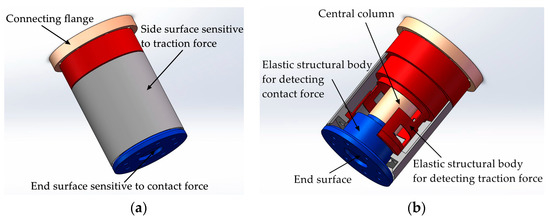 To realize the tandem force sensor, we design and develop a cylindrical traction force sensor firstly. Compared with common wrist force sensors, the unique features of the cylindrical traction force sensor are that it senses external force applied to the side surface and its internal space provides adequate space for the central column. The basic structure of the ESB of the cylindrical traction force sensor is a thin-walled cylinder. The free end of the thin-walled cylinder-shaped ESB is connected with the side surface of the traction force sensor, and its fixed end is fixed to the connecting flange, as shown in Figure 2 and Figure 4b. The internal space of the ESB is not valuable for the detection of traction force. However, it is significant for the realization of the tandem force sensor. In the tandem force sensor, the central column is not only used to connect the contact force sensor, but also provides rigid support for the contact force sensor and the end effector mounted on it. Hence, the diameter of the central column should not be small, which is 32 mm in this paper. By selecting reasonable structural parameters of the cylinder-shaped ESB, enough space can be provided for the central column, which is one of the main advantages of the cylinder-shaped ESB. In addition, the internal space is also important for the arrangement of the contact force sensor and for the signal lines of the contact force sensor.